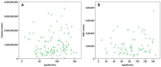 The scatter dot plot demonstrating the relationship between platelet number and age of the patient (months). In relation to the age of the patient, Pearson´s test did not show any correlation on platelet count (p = 0.465, r = 0.07) (A) and WBC count (p = 0.283, r = 0.141) (B) across all the patients included in this study.