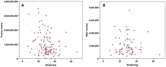 The scatter dot plot demonstrating the relationship of platelet number with weight of the patient (kg). Pearson´s test showed a negative correlation between weight of the patient and platelet count (p = 0.003, r = −0.283) (A) and with WBC count (p = 0.873, r = −0.019) (B).
