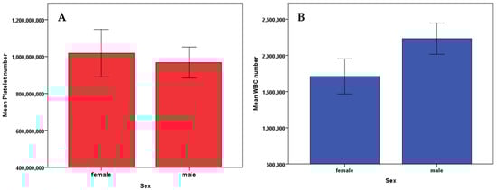 A two-tailed t-test showed no difference between sex of the patient and platelet count (p = 0.736) (A), or WBC number (p = 0.126) (B). Error bars represent ± 1 Standard error.