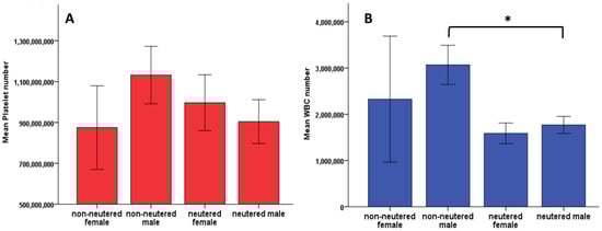 Nevertheless, when comparing the neutered status of our patients with platelet and WBC number, there was a significant difference between WBC concentration and the patient’s neutered status in the male group (p = 0.003) (Figure 5).