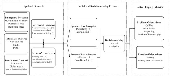 Since the first China ASF case reported in August 2018, all provinces have experienced ASF. There were 99 ASF outbreaks reported in 2018, stamping out over 800,000 pigs. In 2019, 63 ASF outbreaks were reported, with 390,000 pigs slaughtered, and 19 ASF outbreaks with 13,500 pigs slaughtered. By 11 July 2021, ASF outbreaks were reported and 2216 pigs were slaughtered. The outbreak of animal epidemic caused great economic losses, jeopardized the development of the breeding industry, and seriously disturbed people’s normal production and life [9]. Since the most effective approach to control the spread of ASF is quarantine, isolation, culling, harmless treatment, disinfection, and other measures, the pig farmers’ participation and their cooperation in epidemic affected areas is of great importance. According to the latest Emergency Implementation Plan for African Swine Fever Epidemic issued by the Chinese Ministry of Agriculture and Rural Affairs, quarantining infected areas require prohibiting the entry and exit of susceptible animals and products in relation, and setting up temporary inspection and disinfection stations. Harmless treatment highlights to the process of treating diseased and dead animals and related animal products by physical and chemical methods to eliminate the pathogens they carry. Extant studies revealed that pig farmers’ coping behaviors were not always complying with government interventions, for example, not cooperating with preventive measures, unwilling to report the epidemic, and selling infected pork in an animal epidemic [10,11]. Therefore, it is of great significance to explore the mechanism of farmers’ coping behaviors in an outbreak of animal epidemic in order to formulate targeted strategies.
