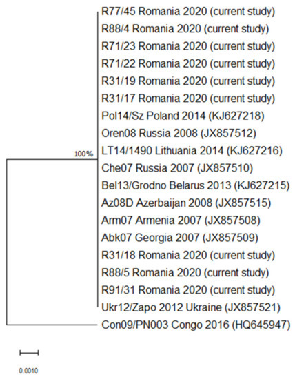 From the first report of an ASF case in 2017, there were more than 3800 confirmed ASF outbreaks in Romania, with a countrywide distribution [23]. However, no data regarding the circulating genotypes are currently available in the country. The present study aimed to identify the circulating ASFV genotype in a county from the central part of Romania in the context of ASF outbreak.