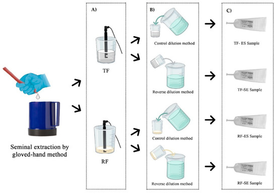 The semen collection by the gloved-hand method is shown and the steps during the preparation of the seminal dose are the following: (A) measurement of the sperm concentration by Metrosperm (Tecno-Vet S.L., Barcelona, Spain) in RF (rich fraction) and TF (total fractions) ejaculates; (B) application of the two different dilution methods (control: pouring the extender over the semen-ES; reverse: pouring the semen over the extender-SE; (C) packaging of seminal doses from the different experimental groups. Figure created in Biorender.com, accessed on 21 October 2021.
