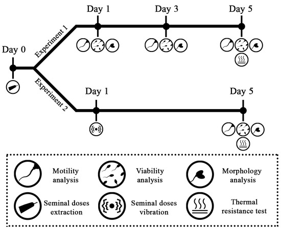 The experimental design of the Experiment 1 and Experiment 2 is represented. The different assessments on sperm quality performed in specific days during conservation (days 1, 3, and 5), and the two tests performed (thermo-resistance test and seminal doses vibration) are indicated according to the symbols below.