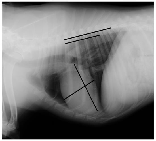 Right lateral radiograph illustrating an example of a vertebral heart scale calculation in a Brittany Spaniel suffering from a myxomatous mitral valve disease with a vertebral heart scale of 11.6 v (the image was acquired using a PICKER CONVIX 80–UNIVERSIX 120 device (Picker International, Uniontown, OH, USA); the kVp, mA, and time settings were not recorded). Two lines are drawn on the heart to measure its long and short axes. They are then transposed onto the spine and recorded as the number of vertebrae beginning with the cranial edge of T4. These values are estimated to one decimal place and added to obtain the vertebral heart size.