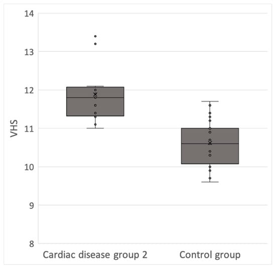 Box plots illustrating VHS values for the two groups (Control group vs. Cardiac disease group 2). Each dot corresponds to the VHS value of a patient.