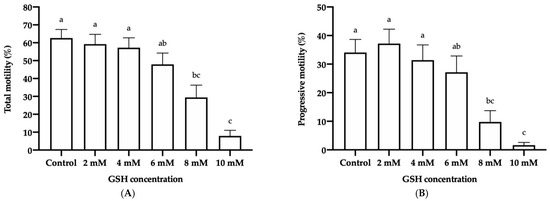 Mean ± SEM of the total (A) and progressive (B) motility of frozen-thawed donkey sperm following cryopreservation with different reduced glutathione (GSH) concentrations. (a–c) Different letters indicate significant differences (p ≤ 0.05) between the control and GSH treatments.