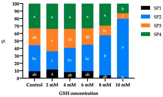 Distribution of the four motile sperm subpopulations (SP) identified in frozen-thawed donkey sperm following cryopreservation with different concentrations of reduced glutathione (GSH). (a–c) Different letters indicate significant differences (p ≤ 0.05) between the control and GSH treatments.