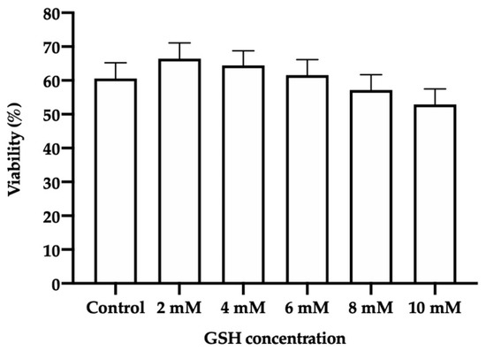 Mean ± SEM of the viability of frozen-thawed donkey sperm following cryopreservation with different reduced glutathione (GSH) concentrations. No significant differences (p ≤ 0.05) between the control and GSH treatments were found.