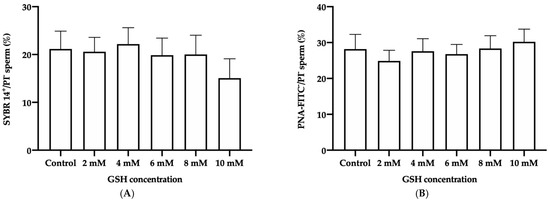 Similarly, no significant differences in the percentage of frozen-thawed donkey sperm with an intact acrosome membrane (PNA-FITC−/PI−) were observed between the different GSH concentrations and the control (Figure 4B).