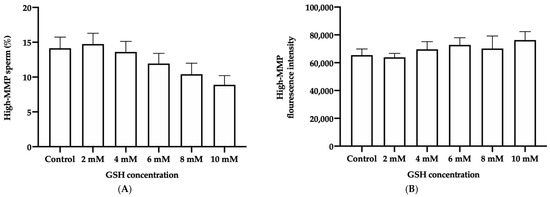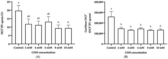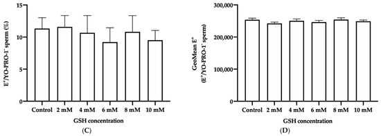 On the other hand, no significant differences in either the percentage of frozen-thawed donkey sperm with high·O2− levels (E+/YO-PRO-1−) or the GMFI of E+ in the E+/YO-PRO-1− sperm population were observed between the different GSH concentrations and the control (Figure 6C,D).