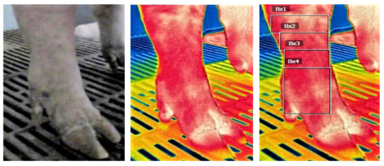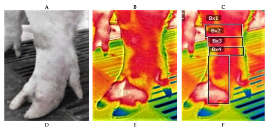 Analog and thermograme view of the regions of interest of one front and the opposite rear foot of two sows. (A): Analog view of front left foot; (B): Thermograme of front left foot; (C): Regions of interest, Bx1 Carpus area, Bx2 Upper Metacarpus, Bx3 Lower Metacarpi, Bx4 Phalanges. (D): Analog view of rear right foot; (E): Thermograme of rear right foot; (F): Region of interest, Bx1 Tarsus area, Bx2 Upper Metatarsi, Bx3 Lower Metatarsi, Bx4 Phalanges.