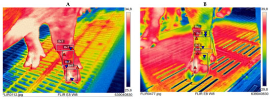 The last week of lactation, thermal images of sows’ lower feet were obtained by the principal investigator by using a high-resolution, long-wave thermal camera (FLIR E x8 Wi-Fi camera, Serial No 639040830, FLIR Systems Estonia, 7.5–14.5 μm, thermal sensitivity <0.06 °C, IR resolution 320 × 240, Accuracy ±2%, Operating T° −20–250 °C), 1–2 h post morning feeding of each farm. Thermograph resolution was calibrated to ambient temperature and humidity before each collection session. The emissivity value (e) which refers to the object’s ability to absorb and emit infrared radiation was set to 0.98 which is human skin emissivity as it refers to other similar studies [22]. In practice, emissivity is usually assumed to be in the range 0.98–1.0, which will have a minimal impact on temperature accuracy (<0.5 °C) [7]. Before measurement, each foot was cleaned out from fecal and dirt, using a dry cloth to minimize interference in IRT temperature. Prior to IRT scan, an acclimatization period of 4–5 min in standing position of sows were conducted. IRT images were captured at a focal distance of 70 cm–90 cm, while the sow was in standing position in farrowing stall avoiding direct sunlight and airflow. In addition, the span of the thermal camera and temperature range of color thermal scale was adjusted so the warmest region of the image appeared white or red and the coolest blue or black, thus maximizing the visual comparison of the thermal image. The acquired IRT thermal images of distal foot, enabled the measurement of skin surface temperature distribution for detecting localized abnormalities. The images were recorded as infrared image files, stored in camera’s memory and were transferred from the camera to a computer using the FLIR Quick Report 1.2 SP software program for image analysis. Quick Report 1.2 SP permitted to select regions of interest (ROIs), using a geometric figure drawn on the desired area. The software program allowed the user to display the temperature at any given ROI and calculated the maximum temperature (Figure 1).