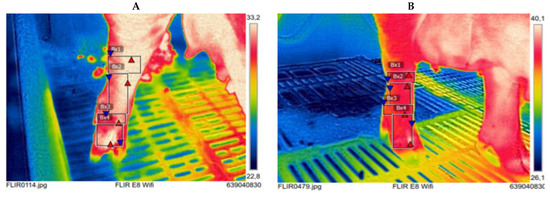 There is limited research evidence for the use of IRT in sows and its association with claw characteristics. It was reported that the IRT temperature distribution of tarsi, upper/lower metatarsi and phalanges of rear feet were increased in case of lameness in sows [11]. In the latter study, however, there was no investigation of the association between IRT of different anatomical sites of lower feet of sows with claw lengths and dorsal claw length difference between medial and lateral claw (anisodactylia). Lameness in sows has been associated with excessive claw growth [12,13]. Additionally, claw overgrowth was correlated with increased frequency of other claw lesions [14,15,16]. Anisodactylia was common in hyperprolific sows of modern genotypes [14]. According to Anil et al. [17] particular types of claw lesions were associated with a higher risk for lameness. It has been shown that in the case of overgrown claws, weight bearing distribution may shift towards the heel that may exacerbate claw lesion, claw horn integrity and claw health [18]. Recently, it was shown that an increase in heel–sole length decreased all mechanical indices of claws in sows [19]. Consequently, claw lesion, overgrowth and claw dissimilarity are the major reasons of underlying tissue damages. Therefore, it can be hypothesized that the use of mobile IRT cameras at herd level could detect any inflammation occurrence with temperature increment in sows. Indeed, in dairy cows IRT has been employed to detect hoof lesions and to an earlier diagnosis of laminitis [2,20,21]. More specifically, sole ulcers and hemorrhages were associated with a higher temperature at the area of coronary band [2,20,21].
