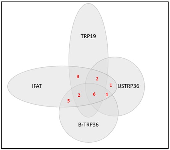 Venn diagram showing combinations of Ehrlichia canis antibodies detected in feline serum samples subjected to the indirect fluorescence antibody test (IFAT) with Ehrlichia canis antigens, and enzyme-linked immunosorbent assay (ELISA) with synthetic peptides TRP19, BrTRP36 and USTRP36.