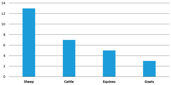 The most reports were regarding treatment in sheep. This is a truly interesting fact that reflects how the daily care of the herd, the in situ action of the shepherds in case of injury to their animals in the countryside or the characteristics of pastoralism in Spain (transhumance) [37,38,40,54] translate into a large number of ovine ethno-therapeutic resources.