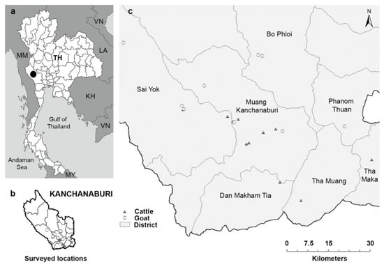 Map showing the sample collection sites in Kanchanaburi, Thailand. (a) Thailand map with Province outline—the black circle indicates Kanchanaburi Province. TH, Thailand; KH, Cambodia; LA, Lao People’s Democratic Republic; MM, Myanmar; MY, Malaysia; VN, Vietnam. (b,c) Surveyed locations in Kanchanaburi. Triangles represent the cattle farms (11 farms), and circles represent the goat farms (9 farms). The names of the districts in Kanchanaburi Province are shown on the map. Images in (b,c) were adapted from the authors’ published work. (Reprinted with permission from Income, N.; Kosoltanapiwat, N.; Taksinoros, S.; Leaungwutiwong, P.; Maneekan, P.; Chavez, I.F. (2019). Copyright © 2019 American Society for Microbiology, Appl. Environ. Microbiol. 85: e02420-18 doi: 10.1128/AEM.02420-18.).