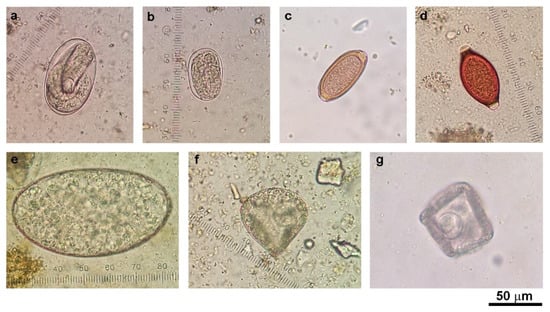 Morphology of gastrointestinal helminth eggs detected in cattle and goat feces by microscopic examination: (a) Strongyle egg (larvated egg); (b) Strongyloides spp. egg (larvated egg); (c) Capillaria spp. egg; (d) Trichuris spp. egg; (e) Paramphistomum spp. egg; (f) Moniezia spp. egg from goat; and (g) Moniezia spp. egg from cattle. Photos were taken under 400× magnification.