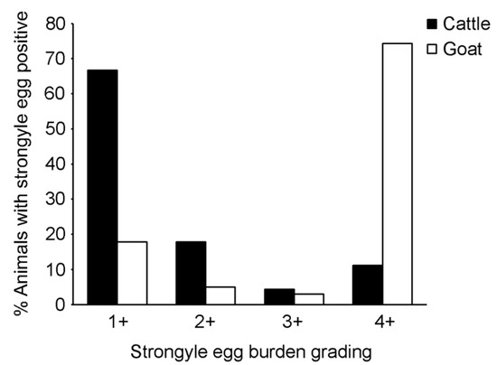 Strongyle egg burden grading. Strongyle eggs were observed and graded under a microscope, and expressed as 1+, 2+, 3+ and 4+. Black bars represent strongyle egg-positive cattle. White bars represent strongyle egg-positive goats.