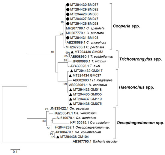 PCR products of the expected size were excised from an agarose gel. The DNA was purified using a QIAquick gel extraction kit (Qiagen) following the manufacturer’s instructions. Purified PCR products were sent for nucleotide sequencing (Bioneer, Daejeon, Korea) using F2 primers. Sequencing chromatograms were inspected and processed using BioEdit 7.0.4.1. Nucleotide sequences were queried against the NCBI database using the BLAST tool and aligned with published reference sequences using ClustalW in BioEdit. A total of 14 strongyle sequences were submitted to the GenBank database and received the accession numbers MT294426, MT294427, MT294428, MT294429, MT294430, MT294431, MT294432, MT294433, MT294434, MT294435, MT294436, MT294437, MT294438, and MT294439. A phylogenetic tree was constructed using the maximum likelihood method based on the Kimura 2-parameter model and bootstrap resampling analysis of 1000 replicates in MEGA 7.0.21.