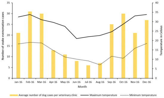 Average number of dogs diagnosed with snake envenomations per month across 19 veterinary clinics, in Queensland, Australia, in 2016 and mean minimum and maximum temperature per month in Queensland, Australia, in 2016 (temperature data were recorded by the Bureau of Meteorology station location 40082, University of Queensland, Gatton, Australia; latitude: −27.54, longitude: 152.34).
