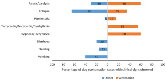 Recorded owner observations indicated that signs of the envenomation were mostly noted after 8 a.m. and before 6 p.m. (65.0%, 13/20). Envenomation occurred in 80.0% (16/20) of dogs in the backyard of houses, followed by pastures and bushland (10.0%, 2/20), respectively. A snake was sighted in two cases. The most common signs of snake envenomation observed by owners were collapse and paresis/paralysis (Figure 2).