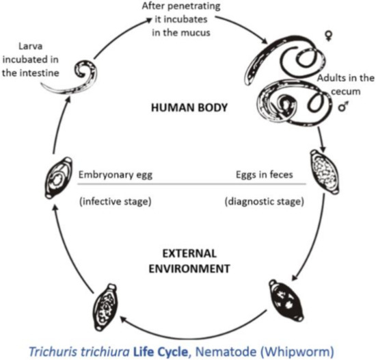 17. Life Cycle of Trichuris Found inside the Body. Available online: https://en.wikipedia.org/wiki/Trichuris_trichiura#/media/File:Trichuris_trichiura_Life_Cycle.tif (accessed on 7 January 2021).