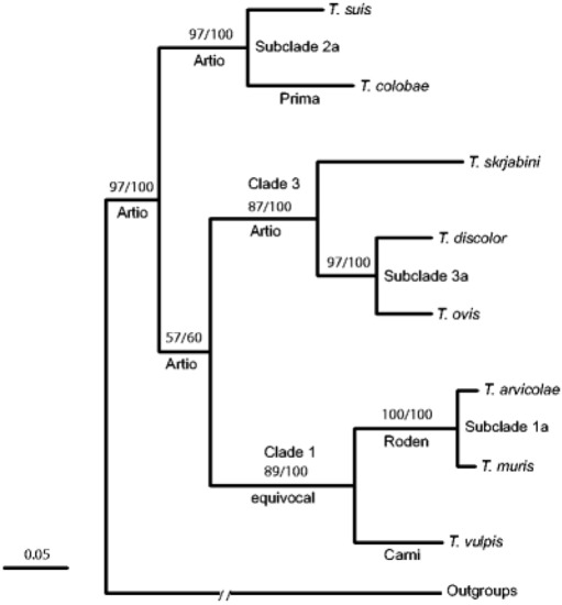 Callejon et al. [41,69] investigated nuclear (18S, triose phosphate isomerase) and mitochondrial (cox1, cob1) genes from Trichuris spp. from nine various host species (Colobus guereza kikuyuensis, Papio hamadryas, Homo sapiens, Sus scrofa domesticus, Capra hircus, Canis lupus familiaris, Bos taurus, Mus domesticus, and Myodes glareolus) from Spain. The data show that Trichuris spp. could be divided in three clades: Clade 1 = T. arvicolae, T. muris, and T.vulpis; Clade 2 = T. suis, T. colobae, T. trichiura, and T. spp. ex Papio hamadryas; Clade 3 = T. discolor, T. ovis, and T. skrjabini [69].