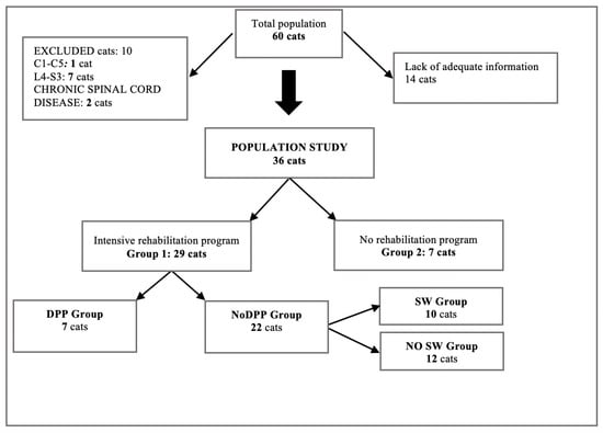 The medical records of the 60 cats that were admitted to the physical rehabilitation center with a spinal cord injury were reviewed retrospectively. Thirty-six cats met the inclusion criteria; 29 were enrolled in the study as group 1 because they underwent an intensive physical rehabilitation protocol, and seven cats belonged to group 2 because they were managed at home without physical rehabilitation treatment (Figure 1).