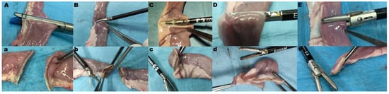 - Gehrig, T.; Billeter, A.T.; Wekerle, A.L.; Shevchenko, M.; Brand, K.; Muller-Stich, B.P. Evaluation of the LigaSure() Vessel Sealing System for bowel transection and intestinal anastomosis-an experimental study in a porcine model. Langenbecks Arch. Surg. 2016, 401, 381–387. [Google Scholar] [CrossRef] [PubMed]