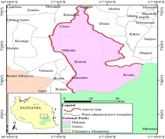 This study was conducted in the wards which lie at the border of Mikumi National Park, Morogoro region of Tanzania, namely, Doma, Melela, Kisaki, Tindiga, Kilangali, Ulaya, Mikumi, Ruhembe, Kidodi, and Kidatu (Figure 1). Mikumi National Park is located in the Morogoro region of Tanzania and lies between latitudes 7 °C and 10 °C south of the equator and between longitudes 36 °C and 37 °C East of Greenwich (Figure 1).The geography of the study area consists of plain land in most areas while some parts are covered by hills.