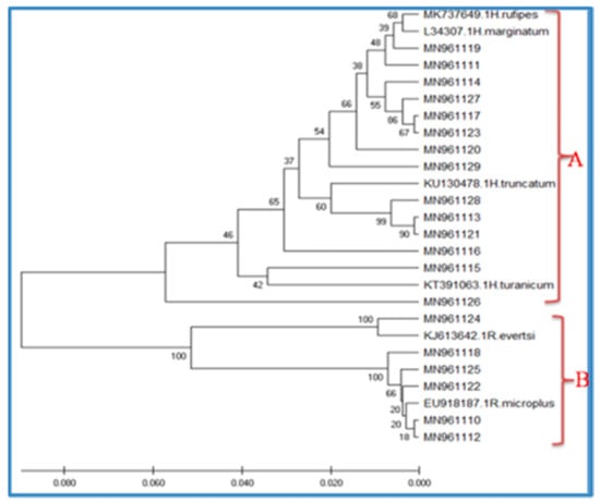 Based on the phylogenetic analysis of themitochondrion16S rRNA gene, two species have been reported in the Rhipicephalus genus, namely R. microplus and R. evertsi (Figure 2). All R. microplus and R. evertsi sequences generated in the present study clustered into one clade (B), together with other R. mmicroplus and R. evertsi isolates from other areas (Figure 2). For Hyalomma spp., sequences from the present study were selected for phylogenetic analysis and four species of H. rufipes, H. truncatum, H. marginatum, and H. mturanicum were recognized. Likewise, all the sequences of the Hyalomma spp. from the present study and GenBank formed another single clade (A) (Figure 2). However, H. turanicum (MN961115 and MN961126) formed a separate group from the H. rufipes, H. truncatum, and H. marginatum within the same clades. H. rufipes and H. marginatum collected during the present study clustered together and formed a complex group (Figure 2).
