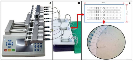 The microfluidic device for detection of microfilariae in canine blood samples. (A) The device consists of a sample injector, which includes an infusion pump (B) with 10 syringes with blunt-ended needle connected to the inlet of the microfluidic chips (C) The schematics of the microfluidic chips and the mf in the detection zone of the microfluidic chip.