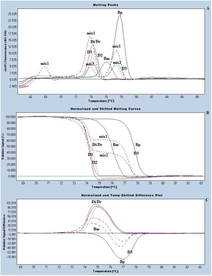 The real time PCR with High Resolution Melting (HRM) analysis for species identification of the trapped mf, (A) melting peaks, (B) normalized difference curves, and (C) the normalized and temperature shifted difference plot of the amplified product of a positive control, i.e., B. malayi, B. pahangi, and D immitis/D. repens and the mf positive dog samples. D1−3 representative DNAs from 119 microfilaria-positive dog blood samples. mix1 and mix2 represented mix infections (represented with a dot line).