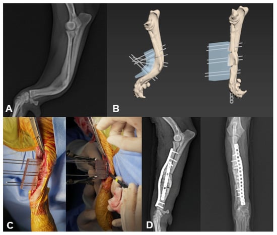All patients who underwent a corrective osteotomy with 3D-PSGs for the treatment of bone deformities between 1 January 2018 to 1 June 2020 were eligible for inclusion. Data collected from the medical records included patient signalment, body weight, history, radiographic and computed tomographic imaging, and type of bone deformities. All patients who underwent a preoperative CT scan and were evaluated postoperatively after a minimum follow-up of six months were included. The occurrence of complications was divided into minor or major. Minor complications were considered as those resolved without additional surgery (dehiscence, incisional irritation, and seroma). Major complications were determined as those needing additional surgery (infection, non- and malunion, and removal of implants) [18,19].