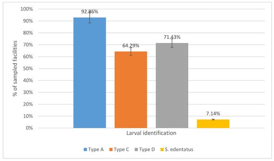 Total number (%) of facilities in which each of the identified larval types or S. edentatus were reported.