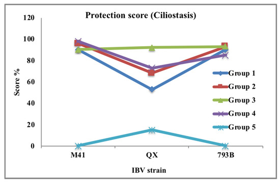 A protection study is not a simple method for application, but several factors were considered during designing such studies [62]. Different methods were used for performing in vivo protection studies using the overall concept of vaccinating and challenging groups to assess whether a vaccine protects against a particular challenge of a local strain. Arvidson et al. [63] established a different approach of viral clearance test from the lungs with particular vaccination and challenge via the trachea. This study allowed for determining an index of protection score that was more than 50% as a protection level, while 90% of the rings had regular activity [64]. The titer of a vaccine prohibited the replication of a challenge virus in the lungs evaluated by titrating lung homogenates in an in vitro ciliostasis test [62]. Studies used lung samples rather than the trachea to minimize the risk of detecting residual effects due to lung tissue supporting IBV growth to a similar level as that in the trachea. Ciliary protection stimulated by IBV vaccination programs against three groups of virulent IBV strain challenges on day 21 post vaccine are shown in Figure 3 [65]. Experimental studies reported that killed vaccines applied without priming with live-attenuated vaccines stimulated lower systemic immune responses, as no more local protection, especially tracheal ciliostasis, leads to systemic infection affected by virulent IBV serotypes [66].