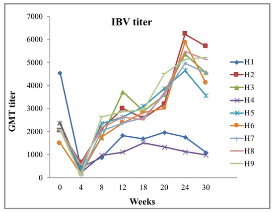 Prior to vaccination, a program needs to be revised according to epidemiological study, the prevalence of a virulent virus, data of sporadic outbreaks, accurate diagnosis, single or combined IBV vaccine, vaccine potency, and monitoring poultry health systems. Immunization is commonly dependent on the challenge of establishing their effectiveness against multiple variants of viruses; a specific time is favorable for the multiplication of viruses, live-attenuated or killed vaccines, and monitoring the titer level or baseline of determination. Essential information details whether bird immunization is protective or a challenge. Therefore, evaluation of the current immunization schedule is not recommended if certain titer limits exist or a virus challenge is circulating in the field [67]. Because of several IBV serotypes, a single serotype of IBV vaccine does not provide more than 50% protection (Ciliary score ≥20), so it is not sufficient protection from a heterologous challenge on the basis of some clinical studies [16,68]. Higher ciliostasis protection (≥80%) was exposed through diverse vaccination of serotypes with Ma5 or H 120 at 1 day old, 793/B or 4/91 at 2 weeks against challenge at 5 weeks of age with two heterologous IBV is presented to be highly effective and good protecting the respiratory tract [16,69]. The results have revealed that applying two or more IBV live vaccines stimulated a higher expression of CD+, CD8, and IgA-bearing B cell in comparison to single serotype of IBV vaccine that promotes to a higher level of cellular and local immunity at the trachea against heterologous serotype [16,70]. Therefore, a vaccine should be selected from one of those serotypes to generate the broad protection of chicken. Alternative types of “multi/monovalent” vaccines, which have at least two serotypes of IBV vaccine or apply new serotypes depending on the high challenge in the farm and neighboring areas, are circulated via the same serotypes. Thus, virulent serotypes of IBV emerging in flocks can be identified by a serotyping assay, and confirmation of a particular vaccination program to protect against new IB isolates [16]. Several studies reported that IB vaccine with multiple serotypes can stimulate the proper antibody response and better protectives abilities against large number of different IBV types and novel emerging serotypes; especially local protection of the cilia in the trachea carried by the protectotype can inhibit secondary bacterial infections [41,71]. This program is generally used due to the more effective and cross-reaction immunity of birds based on actual practice and principle [19]. Virulent live vaccines are more effective and capable of reducing shedding the field challenge compared to recombinant vaccines, inactivated vaccines, and live vaccines, which are not highly homologous with a field challenge virus [72]. Most vaccines are inactive during the infective stage where birds are previously infected at the time of vaccination. As a result of acute infection, the immune organ is not fully working toward the activation of the immune system, as chickens do not generate a satisfactory level of antibody titer. Excessive rolling-type reactions are rarely found in close-contact houses, causing delayed immunity in the farm. The studied serology was conducted in 9 houses of chicken breeder flocks for the field trail (Tuaran breeder farm, Sabah, Malaysia), previously immunized with a few live and killed vaccines day 1 and day 18: Ma5 in spray; day 10: 4/91 in spray; day 42: IB killed; day 91 in Intramuscular injection: IB Mass in drinking; day 119: IB (4 in 1) killed in intramuscular injection; day 140: IB (4 in 1) killed in the pullet stage, and geometric mean titer (GMT) is shown for 0–30 weeks (Figure 4).
