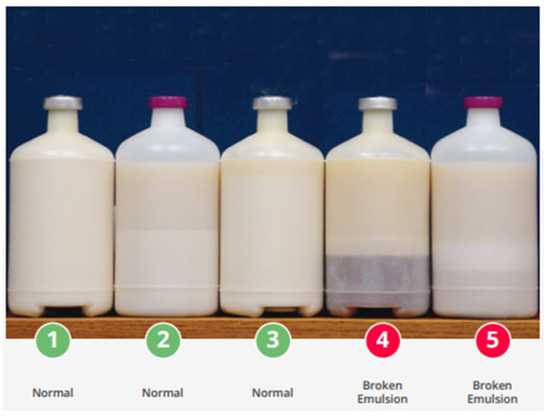 The supervision of vaccine handling, transportation, and storage greatly influences the efficacy and quality of vaccines. A live vaccine is sensitive to over 2–8 °C in storage temperature, so it should be continuously monitored to avoid over freezing until hardening [109,110,111]. Vaccines can spoil or lose superiority when in contact with extreme heating and intense light, leading to faster loss of strength, which greatly affects immunity development in birds (https://apps.who.int/iris/handle/10665/69387). A diluent is mixed before application, and temperature should be maintained by a cooler dropper during ocular and drinking live vaccinations. For IBV vaccinations, the process of live vaccination requires no more than 1–2 h of inoculation or drinking time after exposure to the vaccine [112]. In drinking-water vaccination, the water tank should be clean and containing ice cubes or chiller water until the temperature is maintained at below 20 °C. The actual amount of drinking water needs to be calculated the on previous day to avoid longer vaccination. For killed vaccines, a vaccine is thawed from storage around 24 h before vaccination, but should not exceed 37 °C for more than 5 h. Sunlight can directly destroy the vaccine, so it is prohibited to come into contact with direct sunlight, and the vigorous handling of bottles should be avoided [109]. To ensure vaccine quality, the broken emulsion layer in each batch of received killed vaccines needs to be observed before vaccination (Figure 6). Temperature-monitoring devices (TMDs) are used in recording intervals of at least 30 min that set up vaccine storage and transportation for monitoring the frequency of temperature readings, suitably maintained as required.