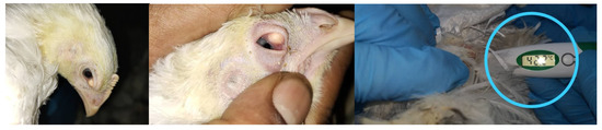 Signs of postvaccine reactions or challenges are characterized on the basis of local reaction, fever, and delayed reaction, and anaphylaxis is a common lesion or systemic reaction indicating that the chicken is reacting to a satisfactorily vaccination or good immunized response against IBV. These types of adverse postvaccine reactions are commonly found in infectious laryngotracheitis (ILT) rather than in IBV. A reaction is more severe in a few cases, with secondary infections such as conjunctivitis and swelling in the facial region, as shown in Figure 7. In most cases, birds react approximately 3–7 days after inoculation, showing slight respiratory symptoms of IBV [113]. Eventually, there are no clear symptoms in a successful vaccination, and blood samples should be collected for monitoring the actual titer in the serum for conformation.