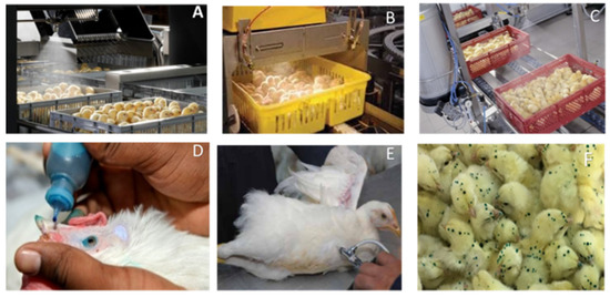Different vaccination methods for respiratory infectious bronchitis virus. (A–C) Spray vaccine in hatchery; (D) oculonasal; (E) Intramuscular injection; (F) Gel-Pac vaccination of Cocci combined with IBV live vaccine (Sources: www.immucox.com, accessed on 29 December 2020).
