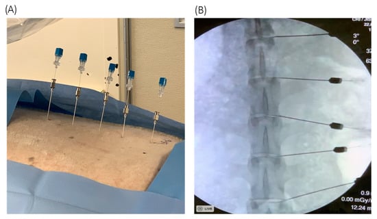 (A) 25-gauge needles within the 20-gauge introducer needles, serially spaced into the lumbar discs. (B) Fluoroscopic radiograph verifying needle placement in the AP plane.