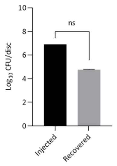 The C. acnes strain selected for this study belonged to the type IA1 phylogroup (C. acnes subsp. acnes) (PD271) and was previously cultured from human pathologic disc material; this was provided by the Central European Institute of Technology (Brno, Czech Republic (OS)). The bacterium was cultured anaerobically in brain heart infusion broth at 37 °C until logarithmic growth phase. The bacterial cells were then washed and resuspended in phosphate buffered saline (PBS) (Fisher Scientific, Waltham, MA, USA). Bacterial counts were carried out on modified Clostridial Reinforced Agar (CRA) (Becton, Dickinson and Company, Cockeysville, MD, USA). Each IVD was injected with inoculum (~0.1 mL) containing ~ 8 × 107 colony forming units (CFU)/mL which was similar to that utilised in previously published rabbit animal model studies with this bacterium [,].
