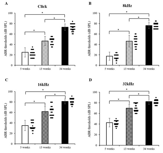 Patterns of hearing threshold in DBA/2korl mice, as revealed by the auditory brainstem response (ABR test): (A) transient click, (B) 8 kHz, (C) 16 kHz, and (D) 32 kHz stimuli. Data are presented as mean ± standard error. * Significantly different compared with each group (n = 37, * p < 0.0001). The data are shown as the mean ± SE.