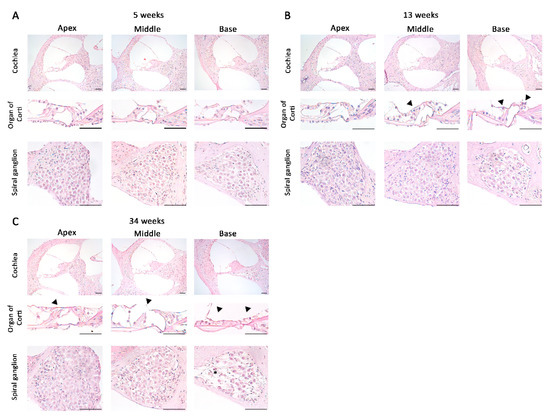 To observe the structural changes in the cochlea of the inner ear with increasing age in DBA/2korl mice, a histopathological analysis was performed using H&E staining at 5, 13, and 34 weeks of age (Figure 2A–C). The structures of the apex, middle, and basal parts of the cochlea were confirmed. At 5 weeks of age, a normal histopathological structure was observed (Figure 2A). At 13 weeks of age, degeneration of the hair cells in the middle turn and basal turn of the organ of Corti was observed (Figure 2B), which became particularly pronounced at 34 weeks of age, when overall degeneration was observed. Furthermore, it was confirmed that the spiral ganglion exhibited degeneration at 34 weeks of age (Figure 2C). These results suggest that hearing loss is associated with damage to the structure of the cochlea.