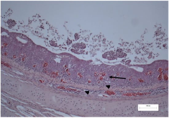 Tissues from the trachea and conjunctiva were collected and submitted to the Scientific Support and Investigation Unit, Ceva-Phylaxia, Budapest, Hungary. They were fixated using a formaldehyde solution and embedded in paraffin. Sections were stained with the hematoxylin and eosin (H.E.) staining procedure. Epithelial hyperplasia, metaplasia, multifocal degeneration and, in a few epithelial cells, nucleic inclusion bodies were detected in the trachea (Figure 3 and Figure 4). Nevertheless, no remarkable histological lesions could be found in the conjunctiva. Unpublished data from histopathological examination in flocks located in the surrounding area likewise confirmed the presence of ILT in birds with similar clinical manifestations, strengthening the incident of horizontal spread of the virus.
