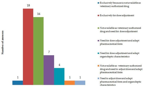 Finally, 49 of 71 GPs who used omeprazole more frequently disclosed their willingness to prescribe compounded formulations. As shown in Figure 1, 18 of 49 GPs (36.7%) justified this treatment because it could more easily undergo dose adjustment to meet the patient’s needs. Forty-seven of forty-nine respondents (95.9%) cited this in addition to one or more reasons: 16 of 49 GPs (32.6%) reported the fact that the active substance is not available as veterinary-authorized medicine in Portugal, 7 (7/49, 1.4%) indicated the need to adapt the pharmaceutical form, 1 (1/49, 2.0%) indicated the need to adapt organoleptic characteristics, and 1 (1/49, 2.0%) reported the fact that the active substance is not available as veterinary-authorized medicine in Portugal and the need to adapt the pharmaceutical form. In addition, 18 of 71 participants (25.3%) who used omeprazole more frequently reported that to achieve optimal dosing of commercially available formulations, they sometimes instructed the patient to open the capsule. Of those who did not subscribe to fractional dosing (53/71, 74.6%), 36 (36/53, 67.9%) acknowledged their use of compounded formulations instead.