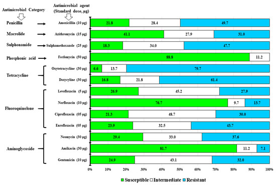 - Yasmin, S.; Nawaz, M.; Anjum, A.A.; Ashraf, K.; Ullah, N.; Mustafa, A.; Ali, M.A.; Mehmood, A. Antibiotic susceptibility pattern of Salmonellae isolated from poultry from different Districts of Punjab, Pakistan. Pak. Vet. J. 2019, 40, 98–102. [Google Scholar]