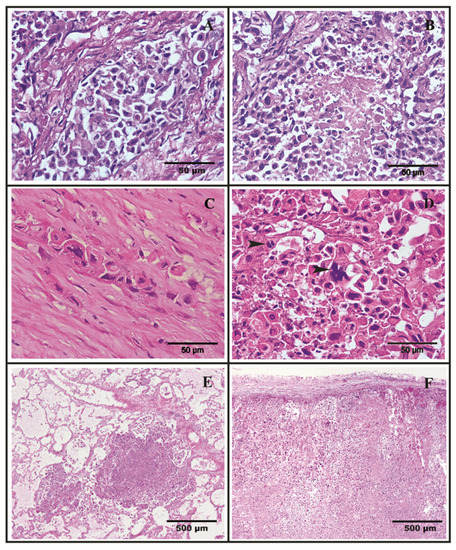 (A) Primary mammary tumor tissue with vascular invasion by neoplastic cells (H&E staining, 40×); (B) Necrosis affecting large areas of the tumor (H&E, 40×); (C) Neoplastic cells are frequently individualized or arranged in small nests surrounded by dense and abundant collagen fibers (desmoplasia) (H&E staining, 40×); (D) Giant and multinucleated cells (arrowheads) were frequently present, and severe anisokaryosis and anisocytosis were common. The nuclei were irregularly shaped with occasional indentations or convolutions present and had coarsely stippled chromatin (H&E, 40×). (E) Lung and (F) supra renal metastases of primary mammary tumor (H&E staining, 4×).
