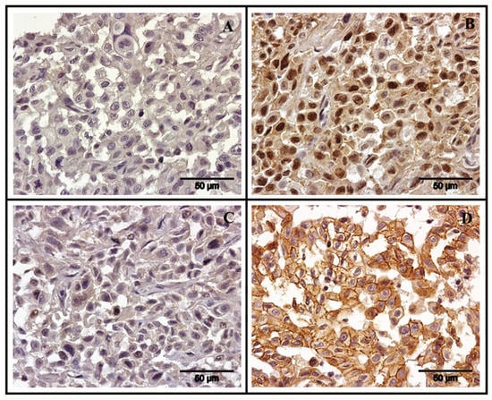 Considering that tumor cells were poorly differentiated and that both anaplastic carcinomas and anaplastic sarcomas display this feature, pan-cytokeratin immunostaining was performed to verify the epithelial nature of the tumor and to help discriminate between these tumor types []. Moreover, the proliferation rate of the tumor was determined by calculating the Ki-67 index. Accordingly, the Ki-67 proliferation index was assessed by analyzing the percentage of Ki-67-positive tumor cell nuclei in 1000 tumor cells []. For molecular tumor classification, the expression levels of estrogen receptor alpha (ER-α) and the progesterone receptor (PR) were examined in addition to the HER-2 transmembrane receptor status. The antibodies used in this study were previously tested in feline mammary tissues [,], being discriminated in Table 1 with the immunohistochemistry protocols. Positive and negative controls were used for each antigen evaluated: a normal tonsil tissue sample for pan-cytokeratin and Ki-67 [,]; human mammary carcinomas tissue sample with known positive/negative status for the estrogen receptor alpha (ER-α), progesterone receptor (PR) and HER2 assessment [], and feline uterus with cystic endometrial hyperplasia-pyometra complex positive for cyclooxygenase-2 (COX-2) [].